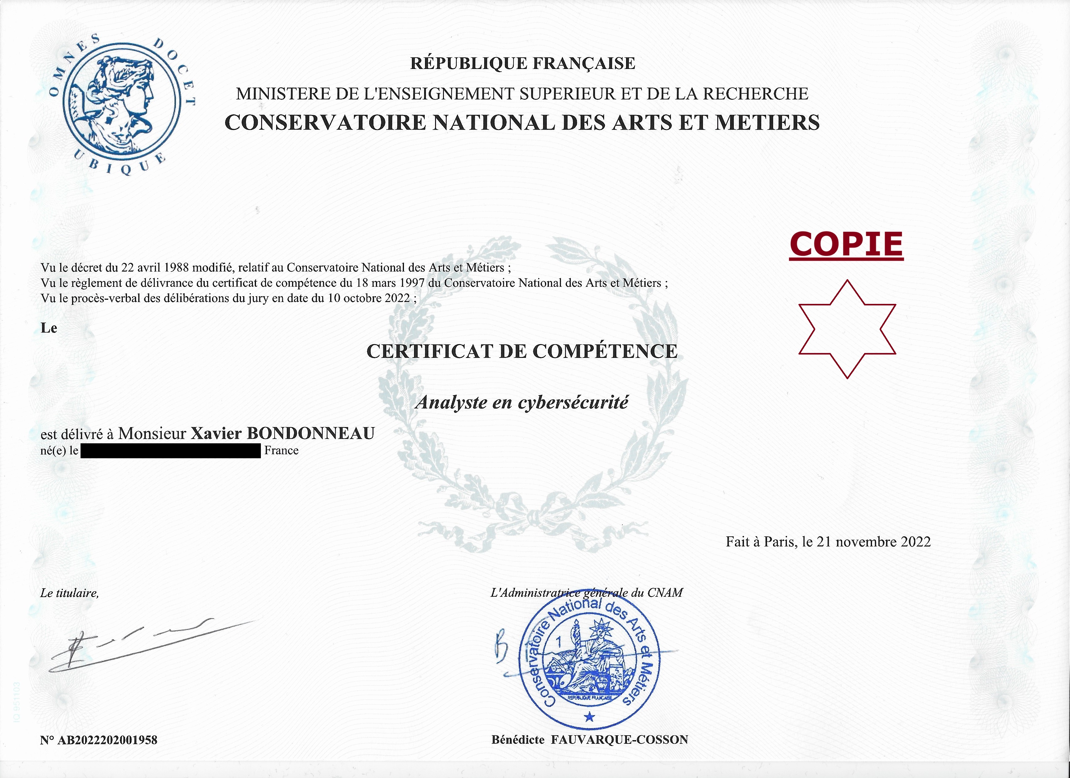 Cursus / Formations * Diplôme Parcours CNAM UE (Cyber) UE (Réseaux) Administrateur Réseaux CNAM - PARIS - 2023 Analyste en Cybersécurité CNAM - VERSAILLES - 2022 Concours Ministère de la Défense - Spécialité Informatique Catégorie B - ILE DE FRANCE - 2019 Technicien Supérieur en Systèmes Numériques - Informatique et Réseaux Individuel - ILE DE FRANCE - 2019 Technicien Supérieur en Conception Industrielle de Systèmes Mécaniques AFPA - MEUDON - 2012 Concepteur Développeur de Systèmes Electroniques AFPA - TOULOUSE - 2010 L1/L2 Sciences et Technologies - Mathématiques, Physique, Informatique PARIS 6 - 2007/2008 |